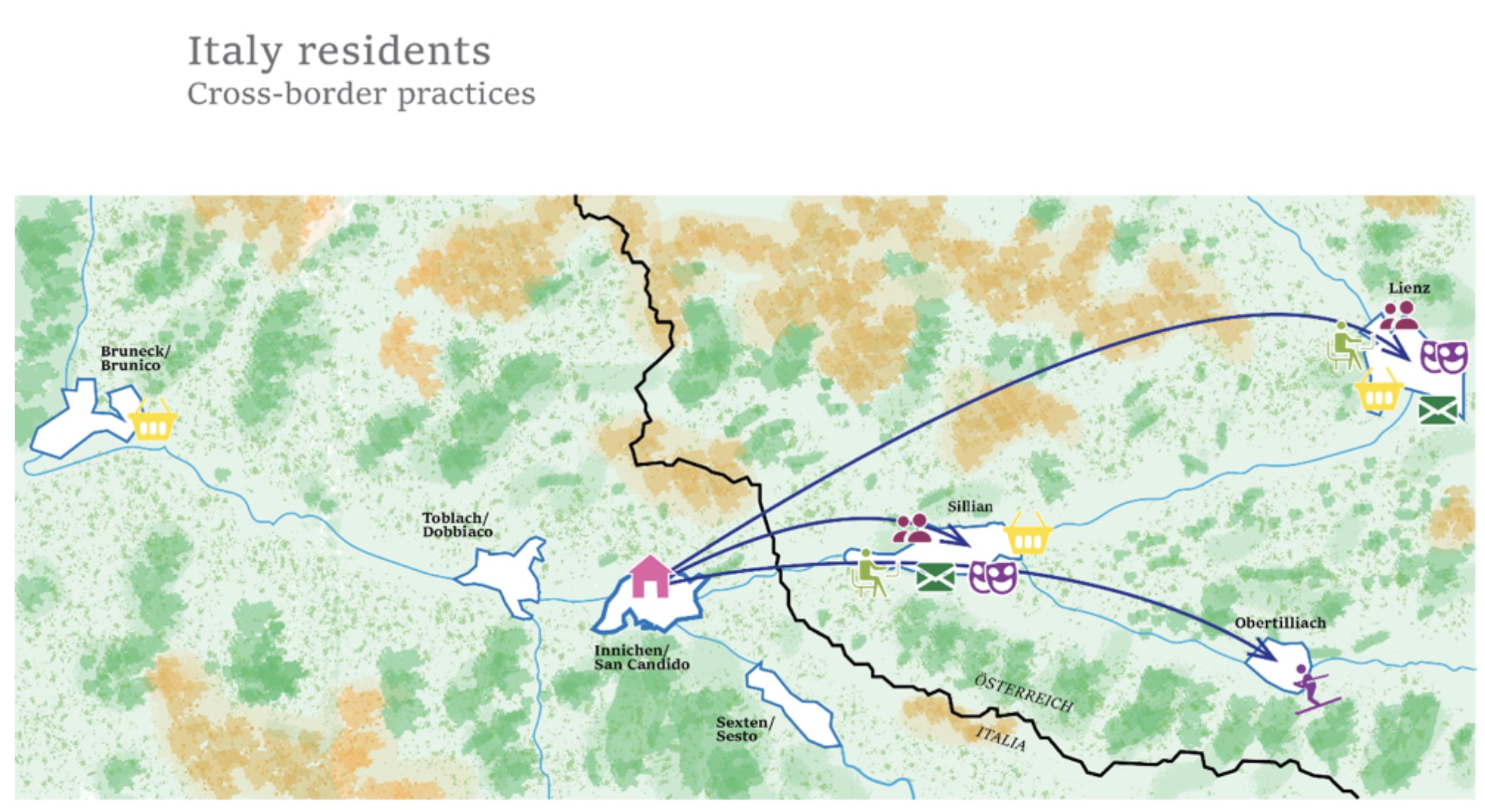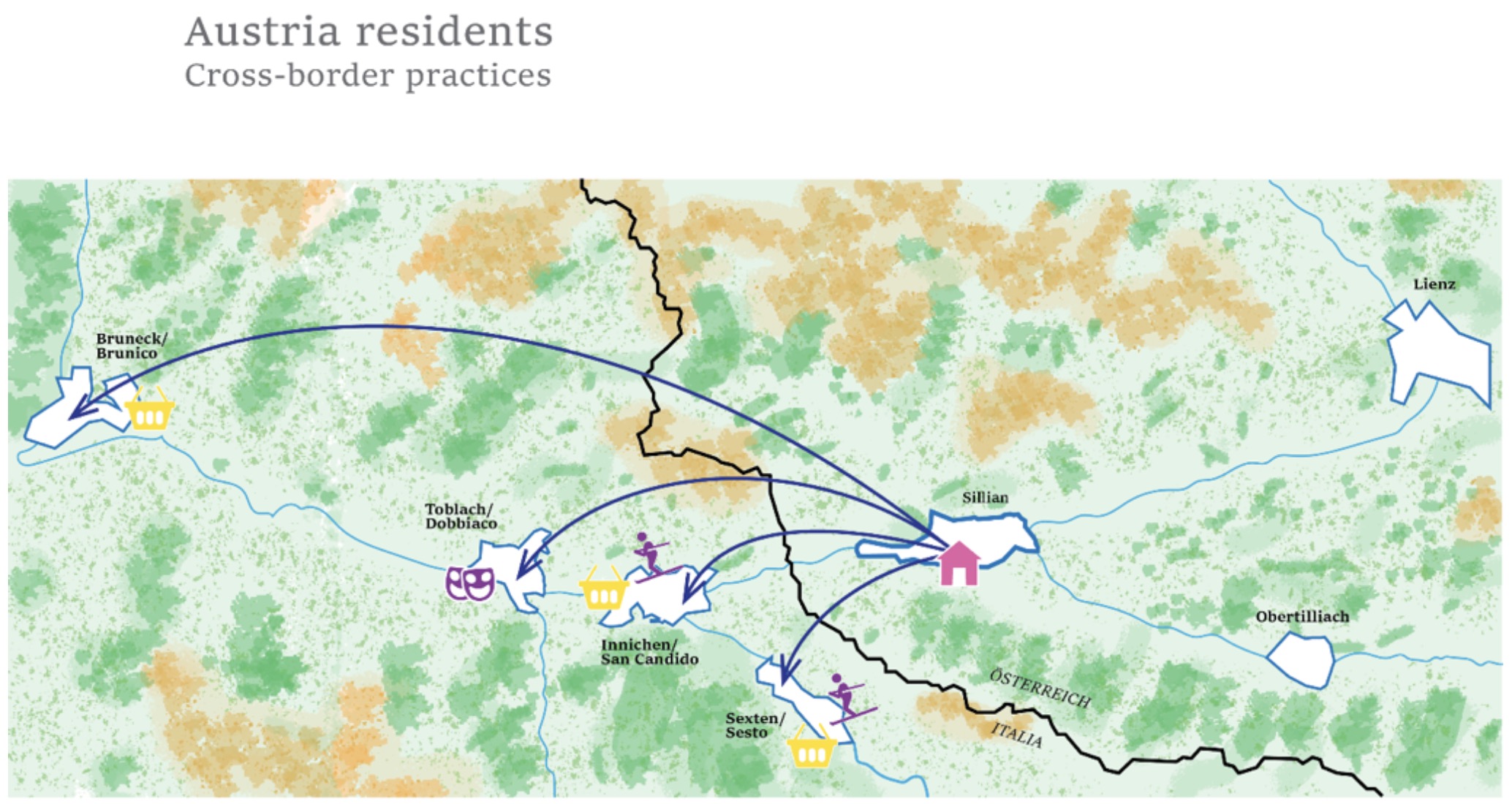 Les résidents italiens d’Innichen/San Candido traversent la frontière non seulement pour les loisirs, mais aussi pour faire les courses, suggérant un engagement plus large avec le côté autrichien. En revanche, les résidents autrichiens de Sillian ont tendance à limiter leurs interactions à leur propre communauté, restant principalement du côté autrichien de la frontière. Les résidents italiens d’Innichen/San Candido traversent fréquemment en Autriche pour accéder à des services comme la poste. Les entretiens avec les participants ont également révélé que les prix des courses et des produits alimentaires sont significativement plus élevés à Innichen/San Candido, ce qui rend plus pratique pour les Italiens de faire leurs achats en Autriche. Ces résultats ne reflètent pas seulement une commodité, mais également une certaine nécessité de traverser la frontière pour répondre à des besoins essentiels. Combinés aux déclarations de nombreux participants soulignant la hausse du coût de la vie, la stagnation des salaires et la réticence à déménager de l’autre côté de la frontière pour accéder à la propriété, ces observations indiquent fortement que la crise du coût de la vie se manifeste activement à cette frontière.Dans l’ensemble, les résultats suggèrent une relation transfrontalière plus extensive du côté italien, tandis que les Autrichiens tendent à maintenir des liens plus forts au sein de leur propre communauté nationale. En outre, les résultats des entretiens suggèrent que la frontière nationale a un fort impact dans l’imaginaire local, en se définissant aussi « les Italiens » ou « les Autrichiens » les uns et les autres. Fig. 3 : Pratiques transfrontalières des Autrichiens. Agrégation des résultats des cartographies de Sillian. Source: PRIN-BordAtlas 19 : Italian Borderscapes Fig. 4 : Pratiques transfrontalières des Italiens. Agrégation des résultats des résultats des cartographies de Innichen/San Candido. Source: PRIN-BordAtlas 19 : Italian Borderscapes After 2020. IX. Conclusion Les résultats préliminaires de cette recherche suggèrent que la frontière continue de jouer un rôle significatif dans les pratiques quotidiennes et les imaginaires des habitants des zones frontalières. Bien que l’infrastructure physique de la frontière soit devenue largement obsolète avec l’élimination des contrôles frontaliers suivant le traité de Schengen et l’approfondissement de l’intégration européenne, le concept intangible de la frontière reste profondément ancré dans l’esprit des résidents locaux. Cette perception mentale de la frontière persiste, éclipsant l’histoire partagée et les liens passés qui définissaient autrefois ces communautés. Bien que ces liens historiques n’aient pas été complètement oubliés, ils ont progressivement reculé à l’arrière-plan à mesure que de nouvelles identités communautaires se sont formées dans le sillage de l’imposition de la frontière. Initialement, ces identités étaient axées sur la résistance à la rupture des liens historiques, mais elles ont évolué au fil du temps, la frontière devenant à la fois plus enracinée et moins visible. Lorsqu’ils envisagent le concept de polycrise, les participants à l’étude se montrent généralement réticents à reconnaître directement la frontière nationale comme un facteur principal. Cependant, ils soulignent les défis découlant des systèmes administratifs différents et des ambiguïtés juridiques lorsqu’il s’agit de gérer des urgences survenant à proximité ou au niveau de la frontière. Ces complications mettent en évidence la pertinence continue de la frontière dans leur vie, même si celle-ci n’est pas toujours consciemment reconnue. L’exercice de cartographie mené dans le cadre de la recherche illustre davantage cette relation complexe, révélant une dichotomie entre les processus de délimitation conscients et inconscients. Il met également en lumière le paradoxe de la frontière vécue comme une « seconde nature » par ceux qui habitent la région, soulevant d’importantes questions sur le fait de savoir si les actions transfrontalières créent réellement un borderscape partagé ou si elles représentent simplement des activités parallèles au sein d’un espace géographique commun. REMERCIEMENTS Cet article constitue une version revue et augmentée du chapitre publié antérieurement dans Power in Transformation: Creative Practices as Catalysts of Change (Kofler & Volgger, 2025, pp. 77–87, Oekom). Il en propose un approfondissement théorique et analytique. Cette recherche fait partie du Progetto PRIN 2022 intitulé « BordAtlas19: Italian Borderscapes After 2020 » - financed by EU - Next Generation EU - Bando PRIN 2022 - D.D. n. 104 del 2 febbraio 2022 - M4 C2 Inv.1.1 Prot. n. 20225TN2R9 - Titolo progetto: "Italian Borderscapes after 2020. Mapping, unfolding, and re-framing border territories in response to the Covid-19 pandemic" - CUP: D53D23010950006 Nous adressons nos remerciements particuliers à notre équipe de projet : Alice Buoli, Raffaella Coletti, Isabella Traeger, Emanuela Rubbino, ainsi qu’à tous les partenaires d’entretien qui ont contribué à cette recherche. |